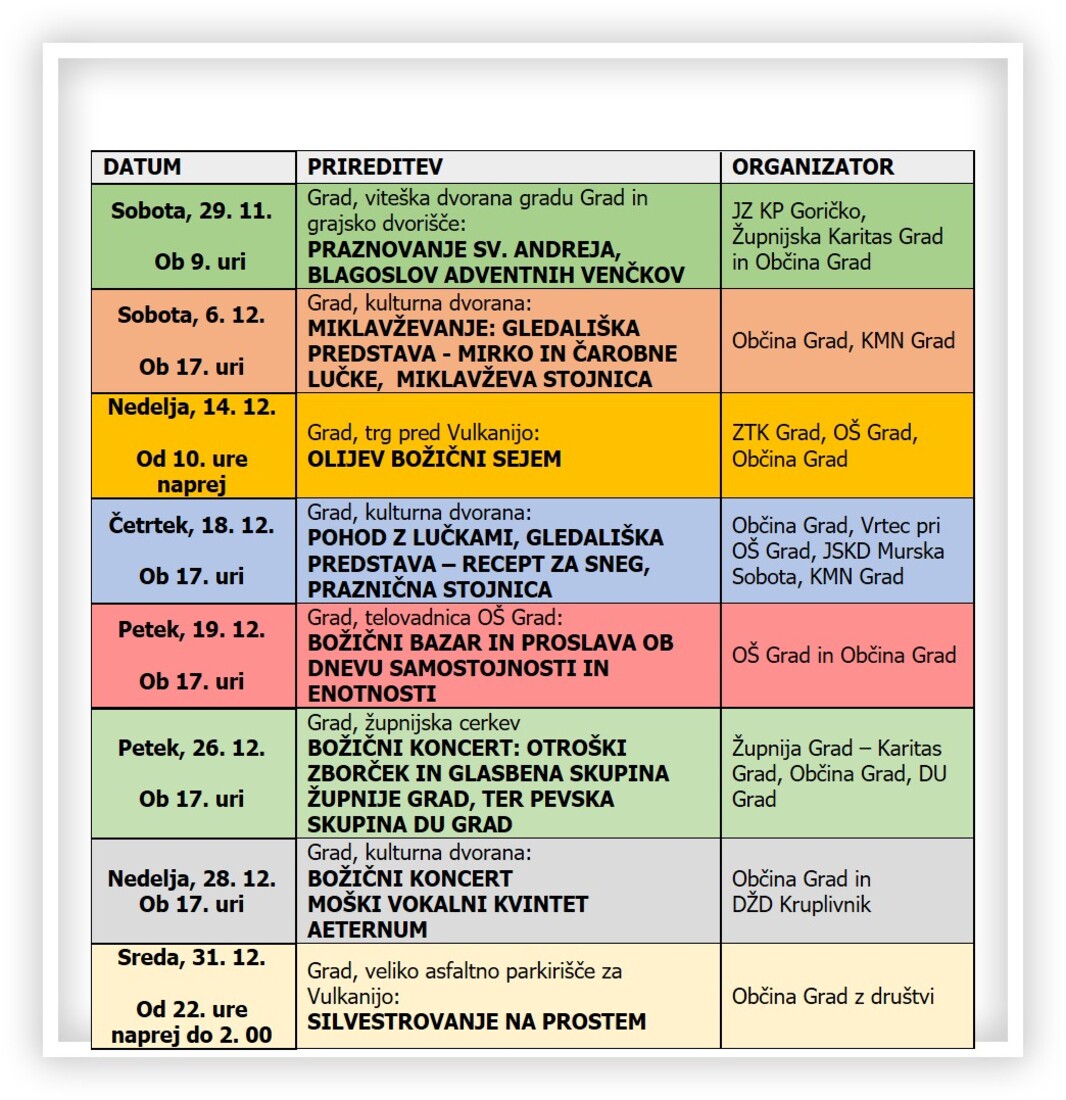 Na občini smo skupaj z drugimi javnimi ustanovami v občini Grad pripravili nekaj prazničnega dogajanja. Sproti vas bomo obveščali preko Informatorja, spletnih strani in f/ObcinaGrad, f/DozivljajskiparkVulkanija, f/ZupnijaGrad, f/EcoGornjiSlaveči, f/EcoBodonci, f/JavnizavodKrajinskiparkGoricko.